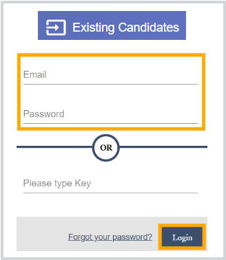 Click the "Existing Candidates" link and log in with your email address and password as seen below.