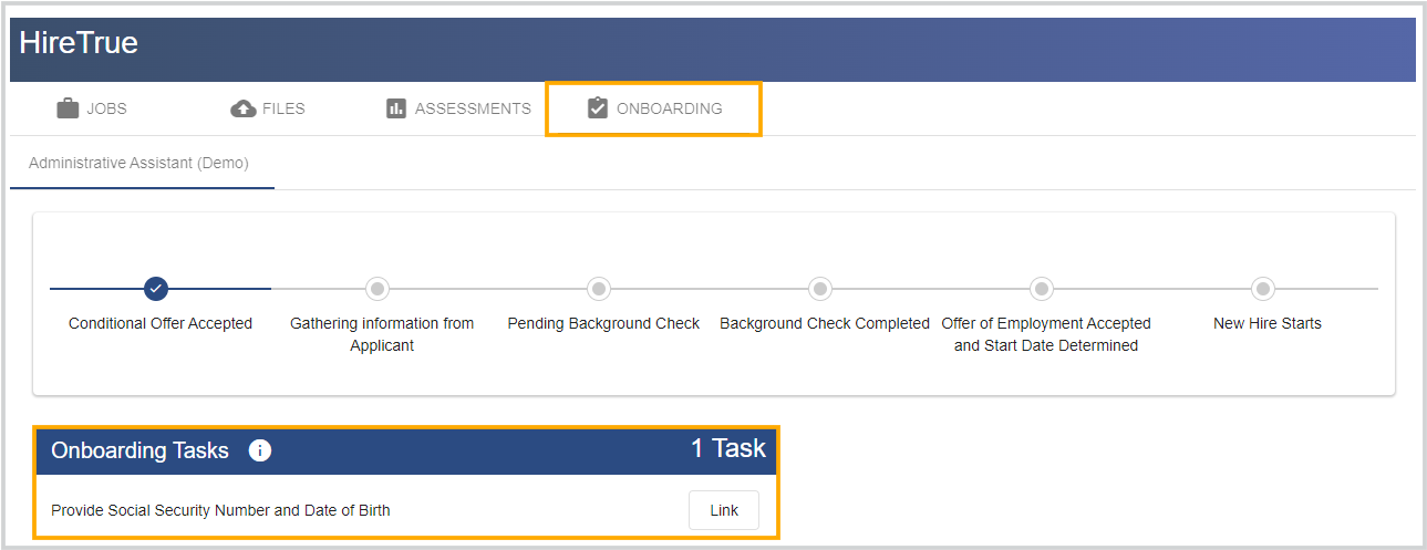 Once you find the "Onboarding" tab, click on it, and all available tasks for your new position will be displayed in front of you. Click "Link", "Upload", and/or "Sign & Submit" for all available tasks.